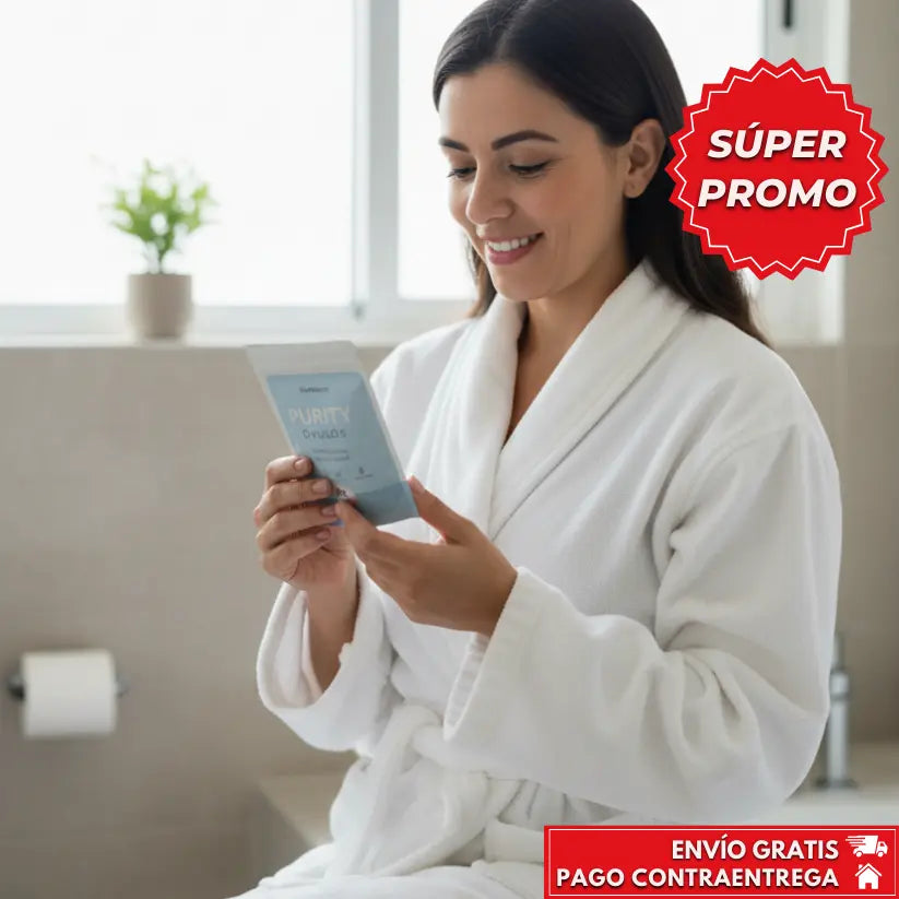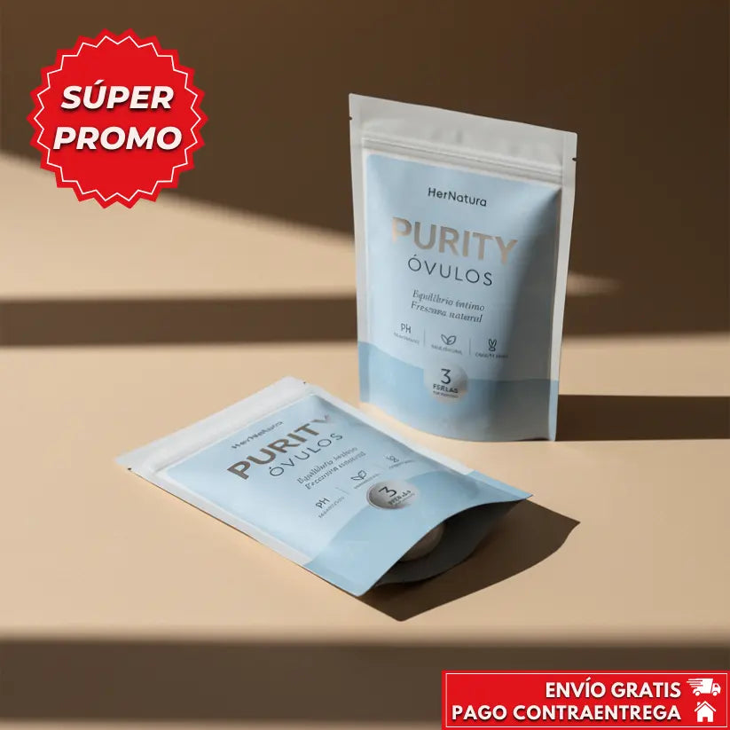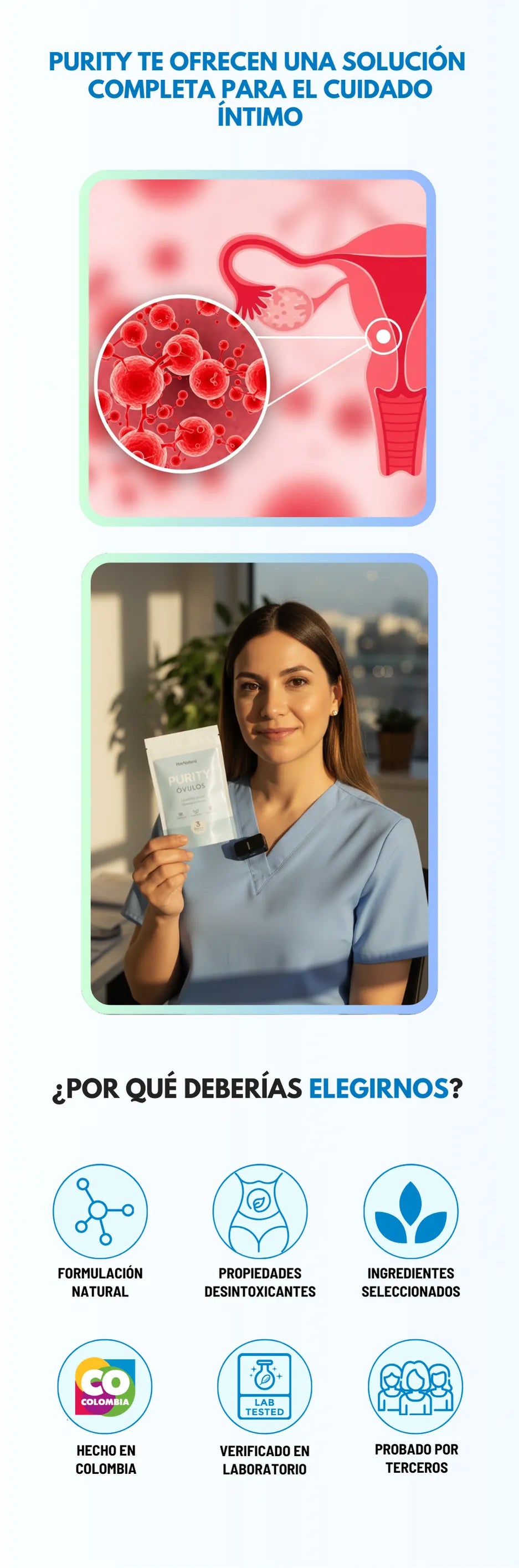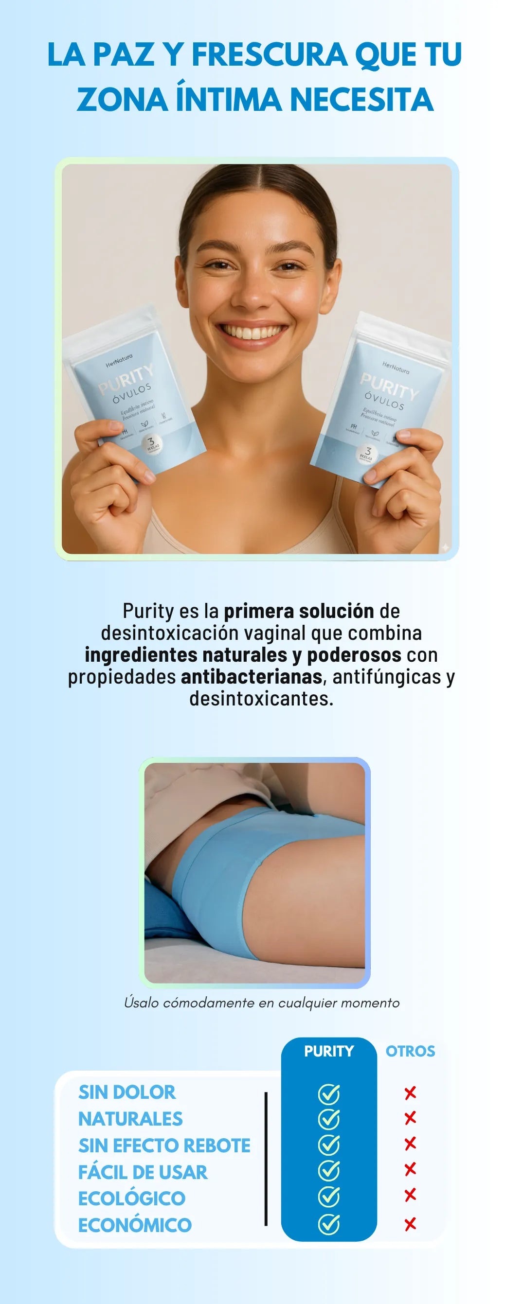 Purity te ayuda a mantener una salud íntima óptima al equilibrar tu flora vaginal, aliviar la irritación, promover la desintoxicación natural y apoyar el bienestar general de tu zona íntima. ¡Siente la diferencia en comodidad y frescura!