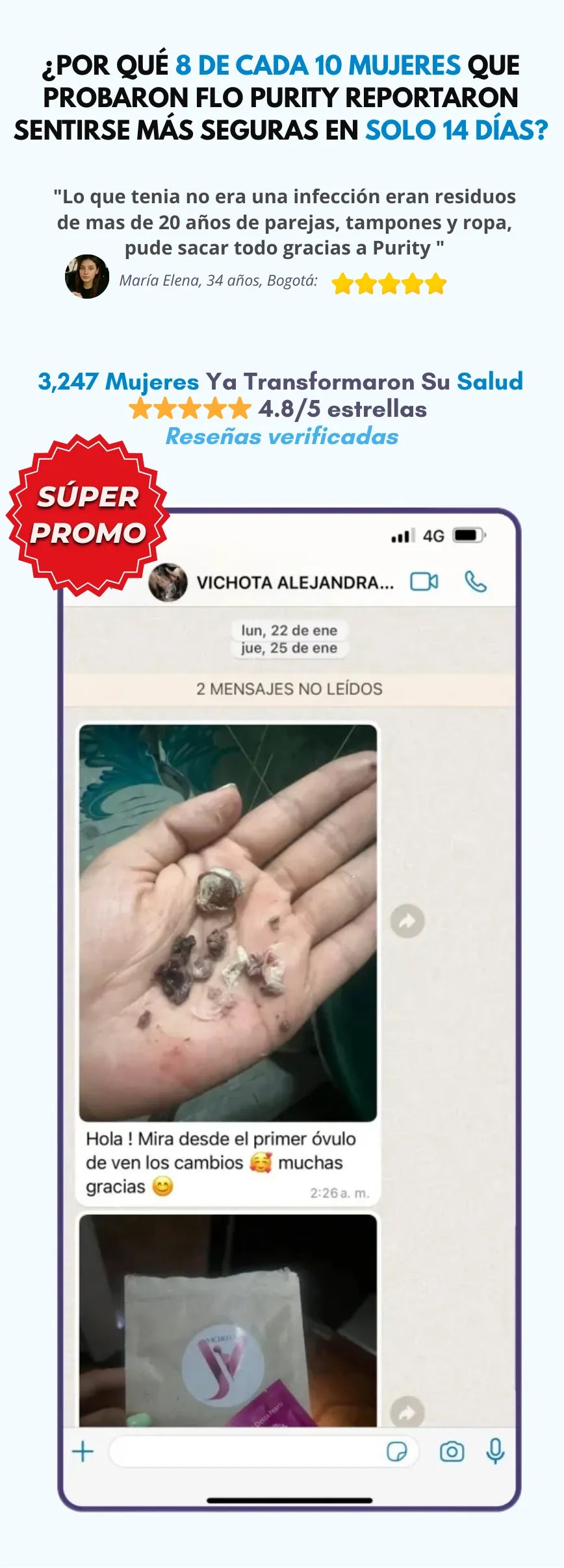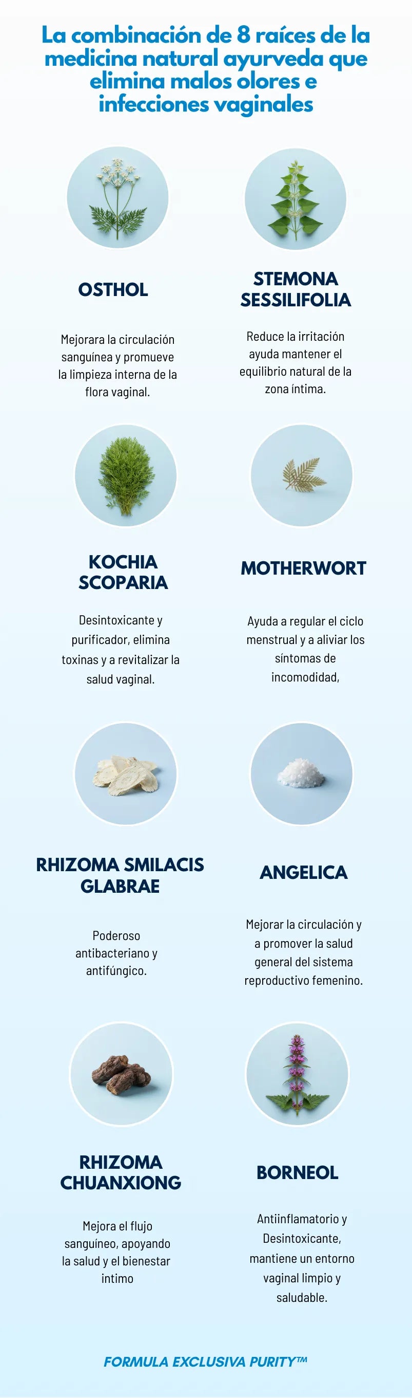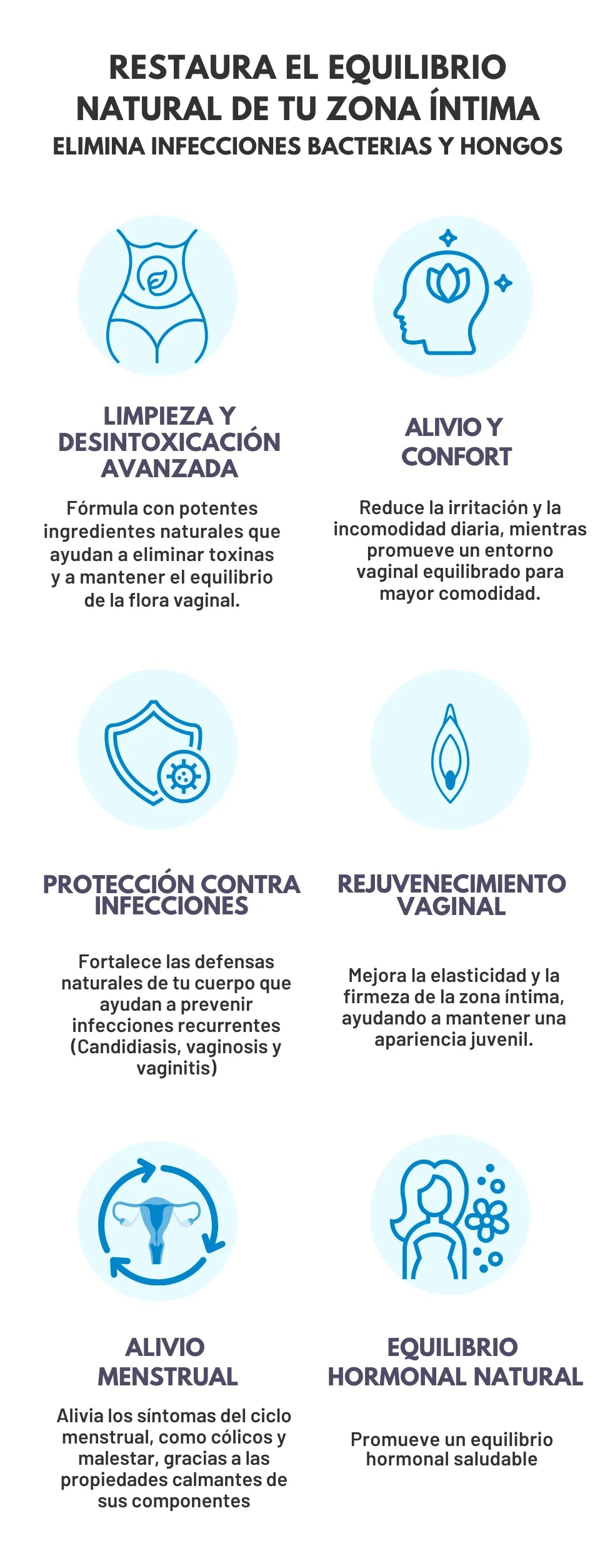 Purity te ayuda a mantener una salud íntima óptima al equilibrar tu flora vaginal, aliviar la irritación, promover la desintoxicación natural y apoyar el bienestar general de tu zona íntima. ¡Siente la diferencia en comodidad y frescura!